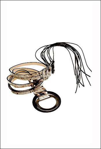 2010春夏,最吸引眼球的单品有什么?腰带肯定是其中一个!从 2009年秋冬延伸至今年春夏,它的潮流度一直居高不下,美人们今夏又可以大秀蛮腰了,MM们即使有点小肚腩也不必气馁,腰带独具的修饰功能,实用程度在一众配饰中绝对数一数二。本季的腰带在极宽、极细的尺度中穿梭,以更多金属元素的运用、镂空手法、材质的多变来诠释新一轮硬朗和极简风潮。