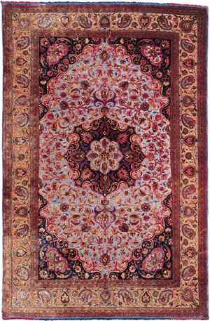 法拉汗真丝古毯就是这样的经典之作。它全部由真丝编织而成,技艺极为精湛,每平方米的编结数量达 100 万个,全毯的结点数约为 297 万个。由于采用了纯植物性染色,随着岁月的沉淀,整张丝毯散发着柔和沉静的光泽,淡紫色、蓝色、玫瑰红、洋红色以及从真丝底部透射出来的丰富的次色调,显得愈发迷人。这条丝毯可以称得上是萨非王朝以来波斯古董毯中的“贵族”。