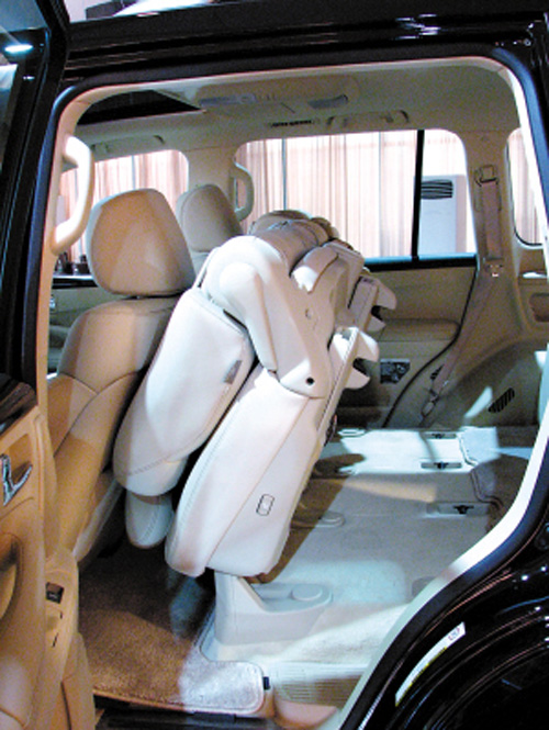 因为车大,所以设计师在LX570上安排了多达28个的出风口和19个扬声器,可以照顾到车内任何一个位置。同样因为车大,LX570专门配置了盲区监测系统,在停车或面对极端路面时,对车身周围情况有最直接的了解。这套系统在车速低于10km/h时自动启用,通过安装在进气格栅和副驾驶席后视镜下面的摄像头提供实时采摄的画面,由中控台中央的液晶屏幕显示出来。不过,话说回来,现在市区停车场划出来的停车位都不大,即使有这些高科技装备的帮助,要把这么一辆庞然大物稳当地停进去并且不越界,也不是一件容易的事情。