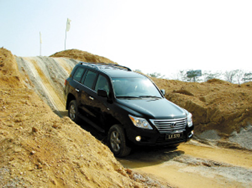 这一次厂家安排试驾路线的难度相当之高,有接近40度角的爬坡、下坡,有泥泞的沙土路面,有大块山石构成的颠簸路面,高度不下于40厘米的水池,还有一个深坑。不过,这也是完成最为轻松的一次,除了上面提到的自动爬坡系统之外,LX570还装备了5.7L V8发动机、6挡自动变速器、四轮主动悬挂高度可控、汽车稳定控制、坡道辅助控制等强大的系统,几乎是“无所不能”,完全可以与军用越野车相媲美,而且驾驭它不需要太高的驾驶技巧,只要拿到驾照,懂得控制方向盘,那就够了,其他行车电脑都会帮你搞定。