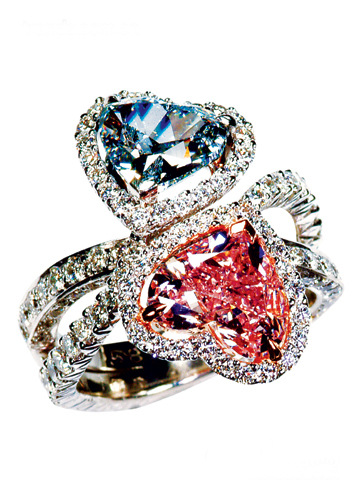 Moneta 铂金镶钻石,主石为心形切割粉色及蓝色钻石