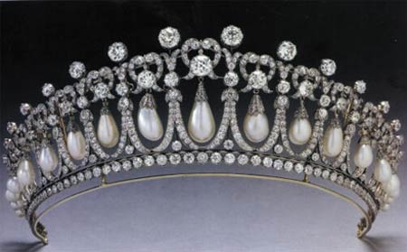“The Cambridge Lover's Knot Tiara”,因为王冠上镶嵌的珍珠造型很像的泪滴,也被称之为“珍珠泪”,它原本属于玛丽女王所有。1914 年,玛丽女王命令珠宝匠依照她祖母公爵夫人的王冠仿造了这顶王冠,冠身全部用白银打造而成,原先顶部装饰有珍珠,自由拆卸的款式设计使拥有者可以根据爱好随意更换宝石的种类。传到戴妃手上时,珍珠被转换成了钻石,拆下来的珍珠则被做成了相配的耳环、项链等。