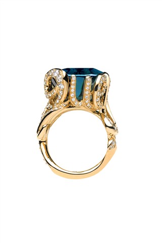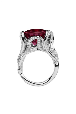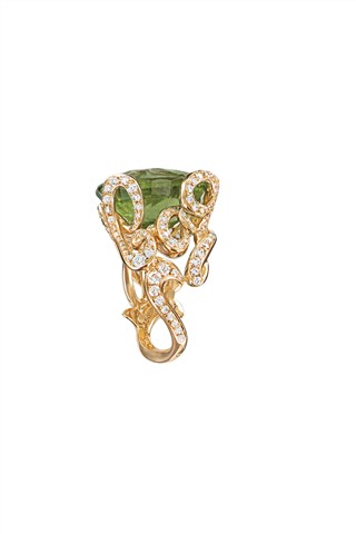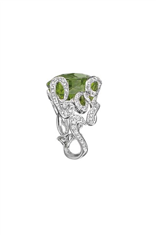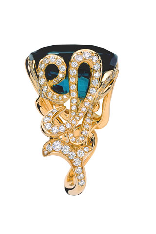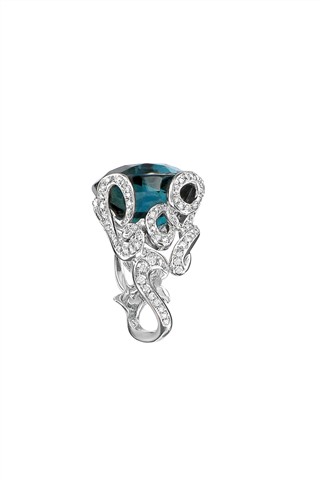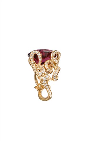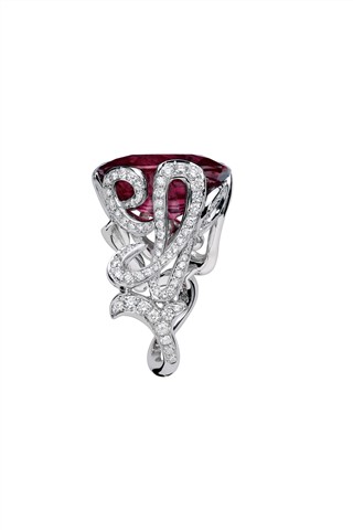 透过 Victoire 的童心与巧思,“La Bague”系列饶富幽默趣味与艺术风尚;细密钻石流动于草写字母间,令每一件作品在指间摆动时散发隐隐波光,衬托碧玺迷人色泽。 从系列名称到设计,“La Bague”系列充分展现设计师的功力与一贯的幽默——“这是一枚戒指”!