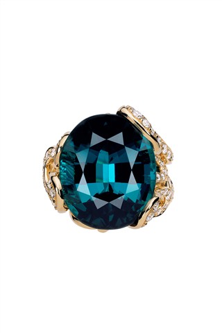“La Bague” 系列中的碧玺皆采用经典的椭圆切割,亦称“French Cut”,让宝石更显光泽、典雅及迷人魅力。由于碧玺通常呈现不同的颜色密度与色轴(异色性),Victoire de Castellane 特别邀请大师级宝石切割专家为“La Bague”系列严格挑选的大克拉数碧玺进行切割处理,务求在保有最高色泽密度的同时,突显每颗宝石最夺目的浓郁色彩。宝石上方被精细雕琢成一个平台及 52 个琢面;底部则细腻雕琢成 60 个切面,让大量的光线能够经由不同角度射入宝石,呈现碧玺极度耀眼的圆润色泽。