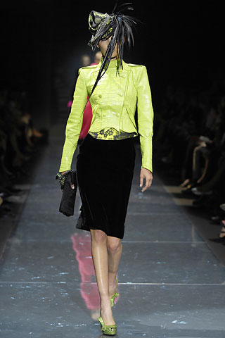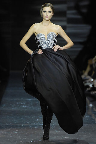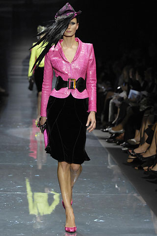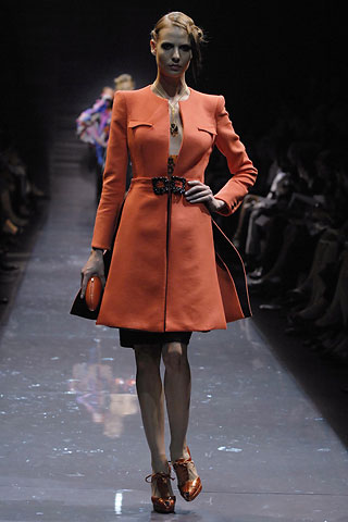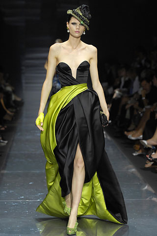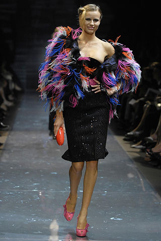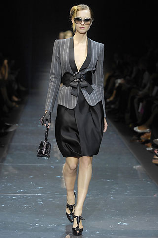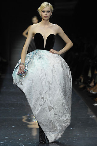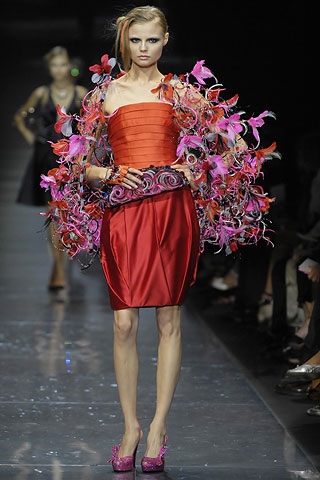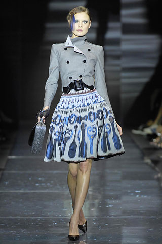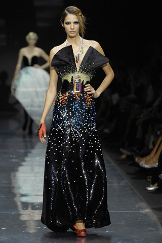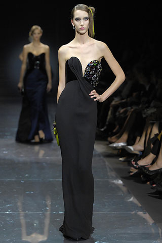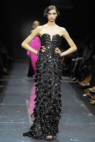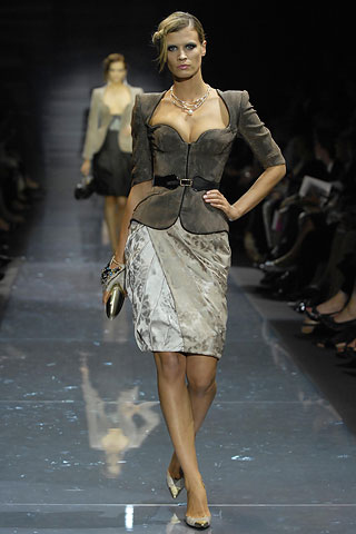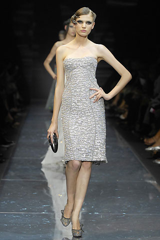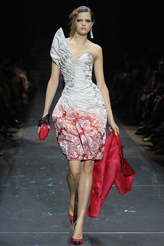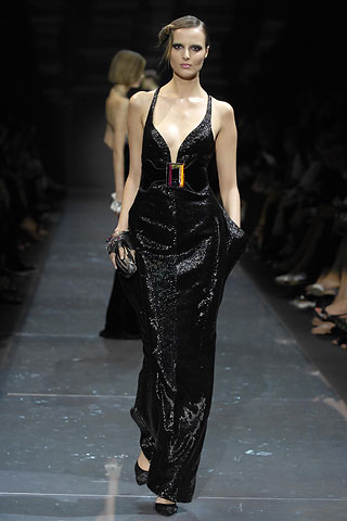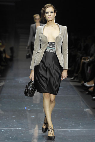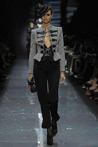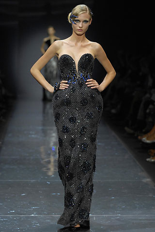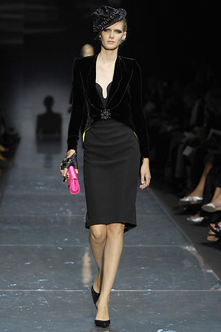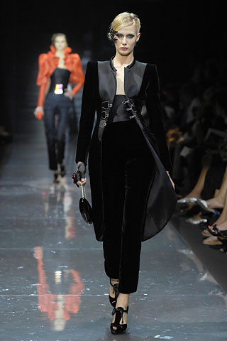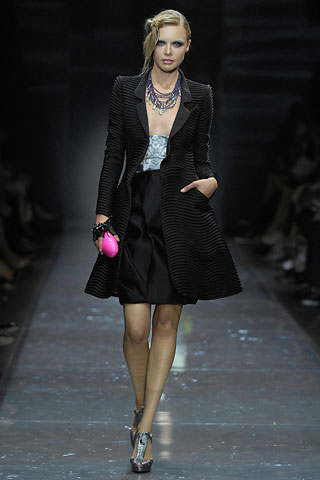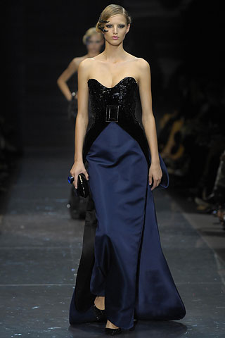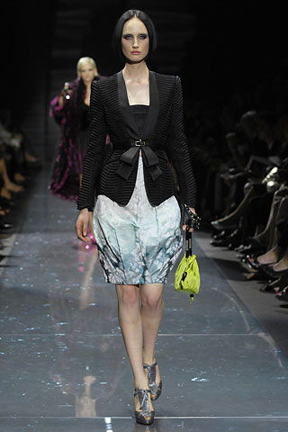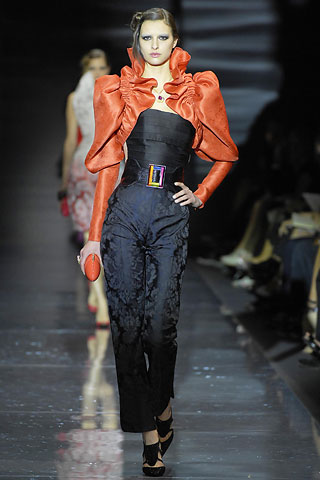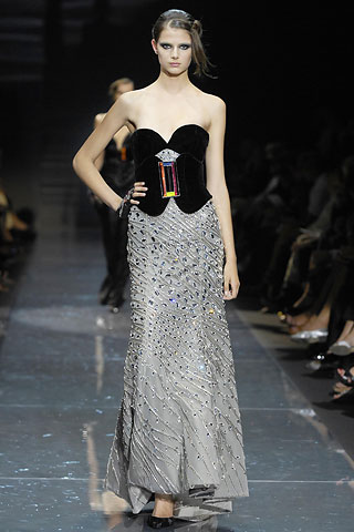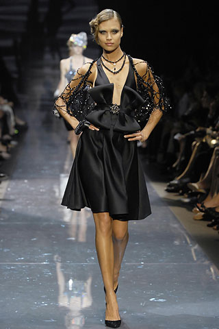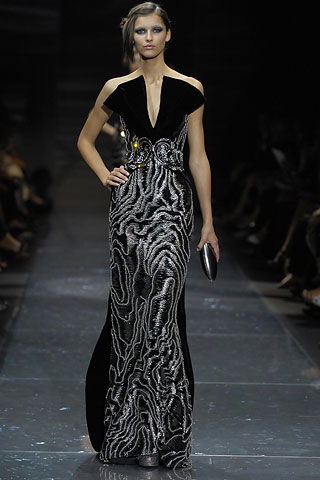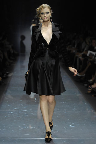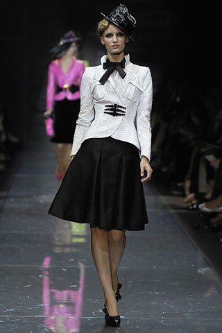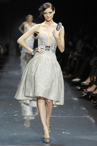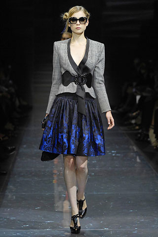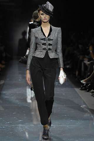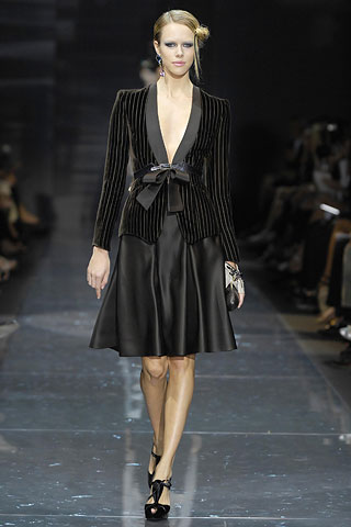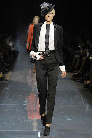 That a woman as self-possessed and innately elegant as Cate Blanchett will fly to Paris to inspect the Armani Privé runway show two seasons running speaks volumes for what can be mined from Giorgio Armani's couture collection for real life. What was she picking out when she watched his "Rock Symphony" so intently? Hard to know, exactly, but by the looks of her, the close-fitting, waisted jackets and the cropped Spencers were meriting a mental note. They were shown with full, short skirts, the best in a blue silk ikat print, and when they were followed by two linear, strong-shouldered tuxedo suits with narrow pants, she probably wasn't the only woman in the room thinking, That could do me nicely.