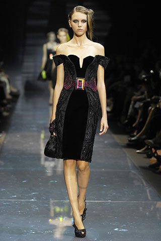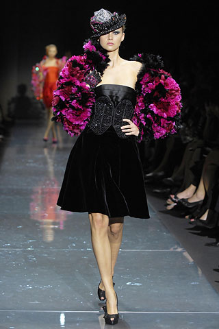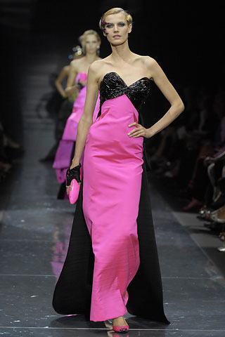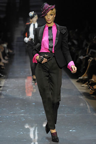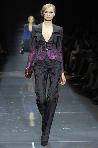 Where was the "Rock" in all this, though? Armani said he'd been inspired by Bowie, which accounted for the glitter booties and squashed fedoras. There were also Jackson-esque fingerless jeweled gloves, worn singly, and an ombré magenta-to-black brocade pantsuit that just might be laid at the door of His Purpleness. That said, there wasn't too much theming going on; in fact, when Armani's eveningwear appeared, it was hard to fathom exactly where the idea for the stiff, podlike, swathed tulip skirts had popped up from. The spaces in between, however, were filled with one or two of the columnar black entrance- and exit-makers that serve sophisticates so well at awards ceremonies. Armani's mannequins, with their pinned and scraped up hairdos, didn't manage to do them justice, but no worries. Get Blanchett in one, and she'll do just that.