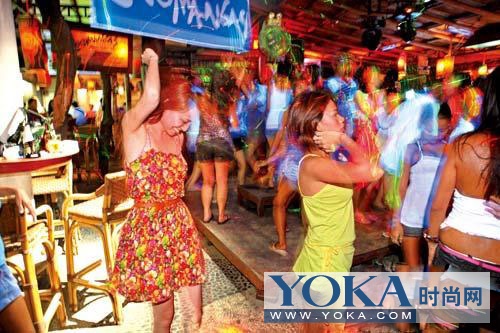由于都是烈性混酒,的确十分厉害,不当心很容易喝趴下。不过估计为了促CocoMan-gas也支持“TeamWork”——三五人合喝一套,喝光了也算成功,无非T恤衫只有一件,名字也只能留一个而已。吧台小姐恪守原则,言明喝一套酒只送一件T恤,想再要?那么再来15杯!第二天把T恤穿出去,觉得好像岛上的游客都是同道中人,起码十分“懂经”,因为人人看见你都会会心地暧昧一笑,摆纹身摊儿的小贩则追着你大加赞美,令人心情大快。