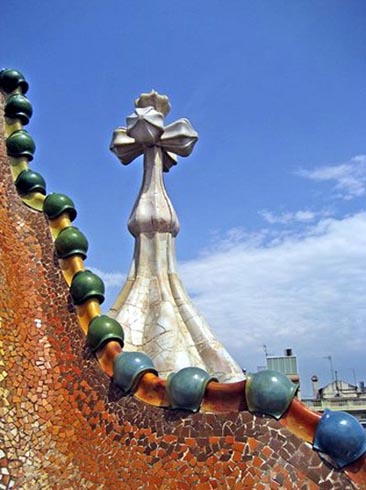 这是西班牙天才艺术家安东尼奥·高迪设计的巴特罗公寓。这座6层楼高的建筑物形状怪异——露台像骷髅,柱子像骨头,屋顶像满布鳞片的鱼背,上面的棱角线像波浪般起伏。
