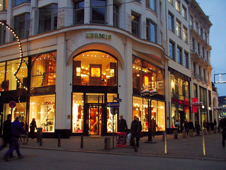 说到名牌手袋,相信你最先想到的就是LV。汉堡的LV专卖店坐落在新墙大街的最深处,然而“酒香不怕巷子深”,白天“LOUIS VUITTON”的金字招牌和夜晚LV LOGO的荧光闪闪,让这家专卖店无论日夜都成为新墙里最耀眼的地方。店面虽然不大,货品却是最新最全的,绝对与巴黎同步。店里的商品通常只有1-2件现货,如果你选中的商品断货而你又有充裕的时间在汉堡停留,那么热情的专柜小姐会为你直接从法国订购,并且空运至汉堡。临别时,最帅气英挺的Security也会送上迷人的微笑和一句温柔的“Wiedersehen”(再见)。