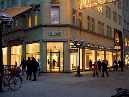 VERSACE空荡荡的橱窗很让人意外,只有大幅海报中的男女主角与你四目相对,这种范思哲式的“骄傲”引得人不得不迈入店中一探究竟。店内的陈设也非常简单,黑白交织的柜台、黑白交织的大理石地板,汉堡的这家专卖店似乎也只出售黑白两色的商品。虽然只有单调的黑白二色,经过范家大师的打造后就完全不同了,添加了各种金属物品和闪光物装饰的服装,正如美杜莎的致命吸引力一样,让人望上一眼就不能自拔,VERSACE帝国永远的图腾与让人震慑的华美在店堂里总能相得益彰。