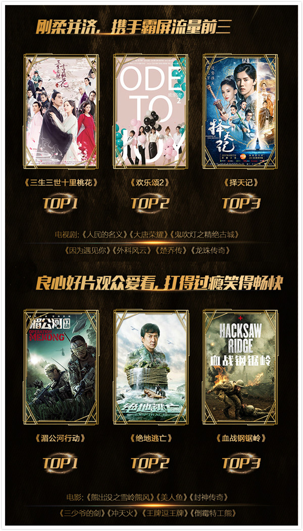 电影方面,《湄公河行动》自去年上线以来,就以火爆真实的动作场面及激动人心的军事行动为人称赞,完美还原的真实事件以及背后蕴含的深刻意义堪称国产片典范,上映期间的口碑与票房双丰收的好成绩延续至网络,成为2017年上半年云视听极光电影点击量冠军,《绝地逃亡》、《血战钢锯岭》也分别位列第二、第三名。这些影片在院线上映时就以好口碑高票房受观众喜爱,院线下线后依然能够在网络收获超高点击,充分说明了他们“良心佳片”的质量,值得反复欣赏。