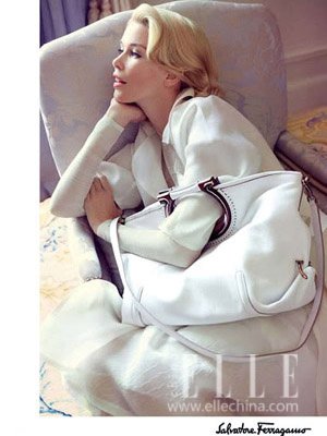 Salvatore Ferragamo的2010春夏广告请了名模Claudia Schiffer以纯白演绎好莱坞明星Grace Kelley的风采。以考究剪裁塑造淑女、妩媚、端庄、性感、隆重各种风情。