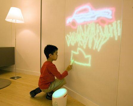 (图1) 上图的为Drag Draw,一支发光笔,可以让你再任何表面涂画,按下按钮就如同橡皮一样可以擦除他们,并且可以通过计算机程序,让画变成动画。