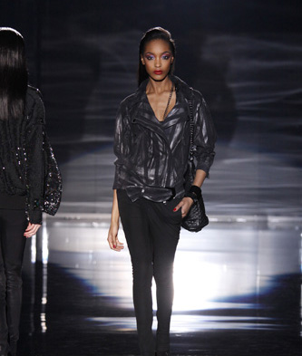 皮革皆做了光滑灿亮的表面处理。及地礼服从晚装的行列中悄悄消失,取而代之的是有着水晶钉饰的短身洋装