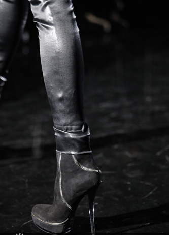 鞋履高耸,且稍带着侵略意味,麂皮或其它仿旧处理的皮革厚底高跟鞋,共同的特征都是有着细高的鞋跟。