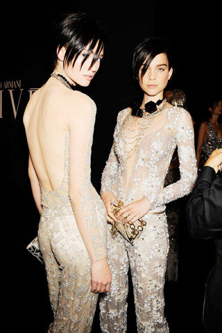 这次2009 Armani Prive秋冬高级定制秀,最抢眼的莫过于最后出场的镶水晶裸色透视裤装。在Armani Prive的后台,超模Toni Garrn、Kim Noorda更是因能穿上这件Armani的终极华服兴奋不已,一看到镜头就迅速摆好POSE,将如此诱人的美丽瞬间记录下来。