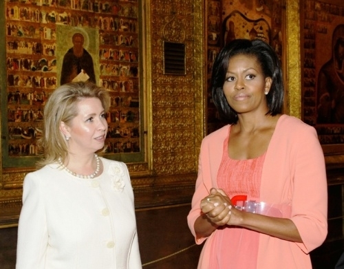 在6日两国总统会晤之际,俄罗斯“第一夫人”梅德韦杰娃邀请米歇尔和她的两个女儿参观克里姆林宫。她们一行人先在花园饮茶,后前往宫内的圣母升天大教堂。她们还参观了兵器博物馆和钻石馆等地。米歇尔除了以衣装入时别具品味著称外,也勇于就教育和保健等重要问题表达自己的看法。