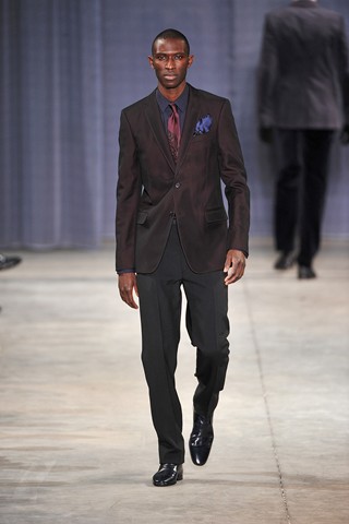LV男装设计总监Paul Helbers说今年的新系列就像是“非洲国王的旅行衣橱”,这大概可以解释大量出现的旅行包,但谁要是真想从该系列中找到像Eddie Murphy的《来去美国(Coming to America)》中的非洲风情,那么一定会振奋不已。虽然以非洲为主题,如衣服扣子上使用的蜥蜴皮装饰,但总体上还是强调低调的奢华感和定制精神。比如运用像羚羊皮或是鳄鱼皮这样具有非洲野性气息的高级材质,在暗橙色调下都剪裁得如军校制服一样笔直、坚挺。模特Vincent Lacrocq演绎的高翻领上衣和相配的裤子,则更像是《星际迷航》中的造型,充满未来感。