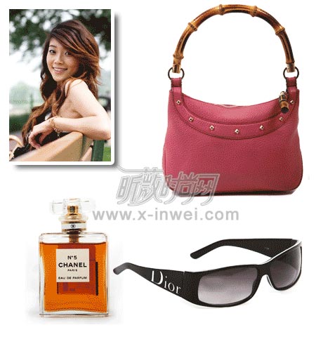 图中包括:Chanel五号香水, DIOR太阳镜以及GUCCI竹节手提包