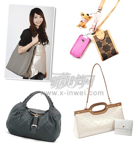 图中包括:LV手提包及钱包,GUCCI手机链和Celine限量版手机套