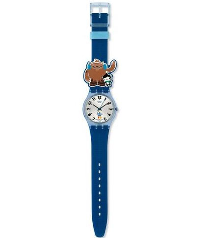 这一款充满运动特色的标准型(Gent)腕表采用深蓝色表带,上端腕带饰有两只代表2010温哥华冬季奥运会的友好吉祥物。