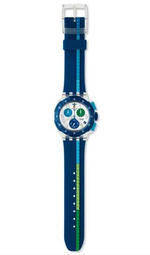 山脉、森林、湖泊与海洋,在冬季的天空下延伸至无限的远方。这一款坚固而实用的斯沃琪多功能原创(Chrono Plastic)腕表采用2010温哥华冬奥会的官方色彩,深蓝色硅胶表带饰以狭窄的竖直线条,组成彩色结构化硅胶方块与深蓝色硅胶表环。