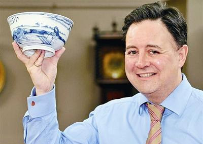拍卖师史蒂文·摩尔手举中国古董碗