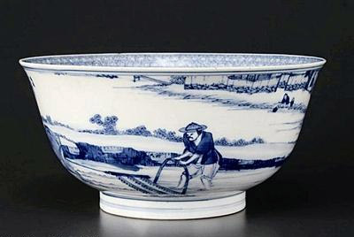 该碗碗口宽约20厘米,碗体上绘有正在耕地的农夫和一头水牛