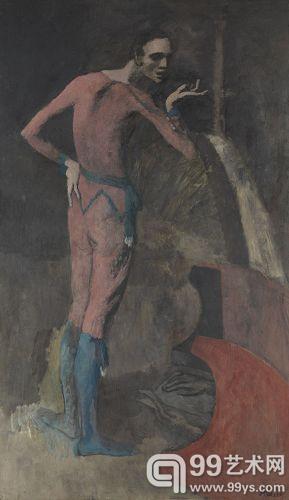 这幅1904-1905年创作的作品The Actor描绘了一个神情憔悴的男子身着布满灰尘的红色戏服站在舞台上的形象。