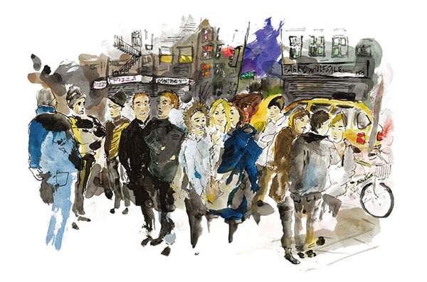 L:当你要在10 分钟的发布秀上画30 张速写时,根本来不及多想,甚至不看纸。但在匆忙混乱之中你反而更能抓住一切的灵魂。我一直训练控制自己的眼睛,相信所见的东西。我常常发现自己头也不抬地涂鸦。我越是努力只画自己看到的东西,就越有把握。我也喜欢观察别人,猜测他们的人生,为他们设计对白。细心观察,带一点幽默感,并且和旁人一样傻乎乎地投入其中,这就是我的创作方式。