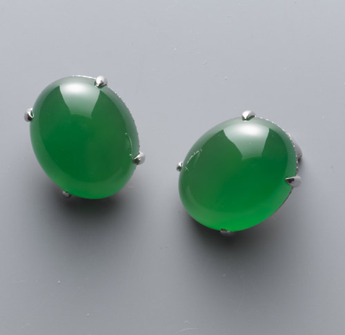 翡翠中最受注目的是一对翡翠蛋面耳环 (估价18,000,000-25,000,000)。翡翠,是由无数细小的硬玉晶体组合而成。这对翡翠蛋面在相当的厚度下,仍展示出绝佳的水、种、色完美成色。要达到此效果,翠料本身必须有完美的品质。独特的透光度,翡翠会映发发出多层次颜色,柔和光泽及透彻的洋绿底色,雕琢成形而体积颇大也是突显其身价的重要元素。要寻找一对翠料相同而又比例一致的蛋面非常艰难,因此它们成为本季拍卖的重要拍品。