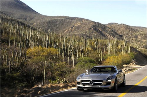 我们继续驾驶SLS跨越桥梁,横穿干枯的河床,巡弋于遍布满仙人掌的丘陵。还有一次,我们停在全副武装的悍马旁边,路边放着卷起来的地钉,到处都是拿着M16和霰弹枪的士兵。悍马上的机枪粗如炮筒,能轻松的把我们的车轰成两节。这个十字路口挨着一个墨西哥石油加油站,是毒贩们通往美国的必经之路,现在正好赶上军队对过往的车辆进行临检。接着继续泛美之旅,这条路连通了阿拉斯加和火地群岛。1988年这项拉力赛恢复进行,现在是老爷车长征赛。墨西哥人依旧热衷于这个赛事,每天晚上都来为我们的车队庆祝,还带着墨西哥风味的盐焗蚂蚱。