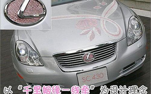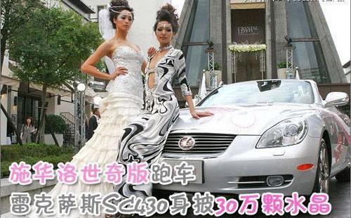 SC430素有The Jewel of LEXUS之称,这台水晶SC430上纹饰主轴是玫瑰花及彩带,以时尚华丽视觉图腾象征婚姻的美丽,再加上旁边身穿中结合高级时装与婚纱的美女车模相伴,雷克萨斯SC340更增闪烁夺目。