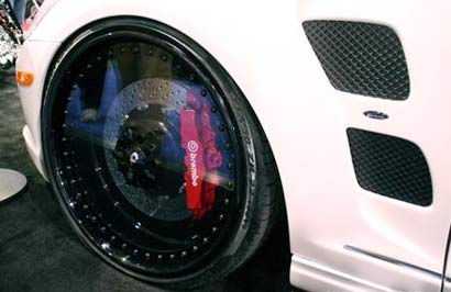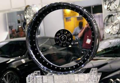 这是我们在这次SEMA展上发现的继37英寸跑胎之后的又一个神奇的轮胎产品,他是用聚碳酸酩材料做成的,所以整个轮胎看过去是完全透明的,产品适用于多种汽车,包括摩托车,被装在Mercedes-Benz CLS上展示,有1.5英寸和2英寸的厚度规格,价格在2000美金一个,是改装车最酷的风火轮,嗯,或许我们应该叫他透明轮毂……