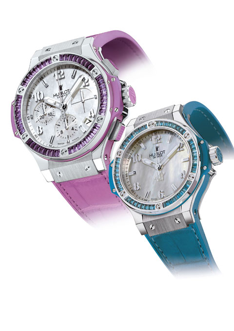 水果系列(Tutti Frutti)手表的韵味富于色彩和质感。 这些Big Bang系列手表有“柠檬”、“苹果”、“玫瑰”、“紫色”、“橙色”和“蓝色”,将于本年度内发售,其特色为钢制表壳配以珍珠贝母表盘。 每一款都配以精致相称的短吻鳄鱼皮表带,内衬橡胶使之更加柔顺舒适。 狭长形切割的黄宝石、蓝宝石、紫水晶或沙弗来石装饰于每只Big Bang水果表的表盘之上,并与其配色相谐。 鲜明色彩的炫目排列充满了微妙之处,具有柔软或酸性光亮色调,超女性的丰富内容使其魅力无可抵挡。