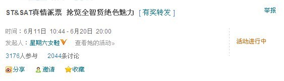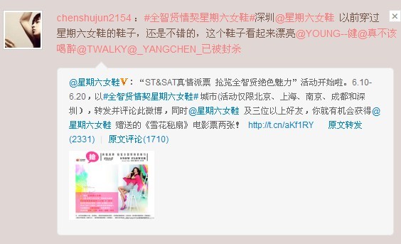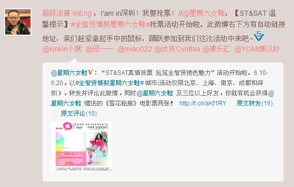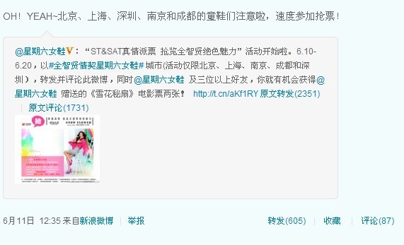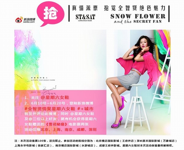 自2011-6-11 10:44 星期六女鞋(ST&SAT)发布“ST&SAT真情派票 抢览全智贤绝色魅力”活动时起,以迅雷不及掩耳之势在微薄上迅速传开,得到各界人士的支持与关注,大家纷纷表示了对全智贤在《雪花与秘扇》中的演出期待,可见,全智贤魅力难挡啊。抢票活动仍在如火如荼进行中,截止到06-13 14:45为止,参加人数已有3176人,想必未参加的童鞋们也正蓄势待发,信心满满。如果说,数字可以预见未来,可见,这场活动将会如何火爆。不要再犹豫,爱他(她),就带他(她)去看全智贤的《雪花与秘扇》,也望北京、上海、南京、成都、深圳五座城市的ST&SAT迷们或全智贤粉丝们奔走相告,让更多人加入到我们这次活动中来,一起享受时空的视觉饕餮,一起感受世间真情意。