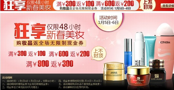 国内最大的时尚B2C购物网站——走秀网继12月29日零时推出“年底终极巨献,全场2折起,折后再7.9折”的大型促销活动后,1月5日—1月6日新一轮的“新春美妆返现秒杀风暴”( http://www.xiu.com/zt/category/78.html?from=11442505)又再次强势来袭。