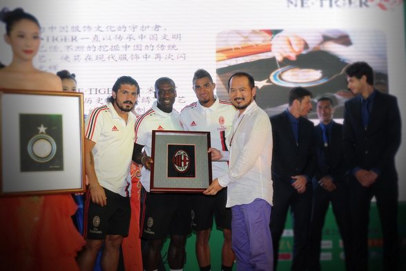 叹服!不仅仅在于华服的奢侈,更在于 NE•TIGER 所代表的那深厚的中国千年文化底蕴。特别是在晚宴上当NE•TIGER创始人张志峰先生向两大豪门赠送由NE•TIGER工艺师手工绣制队徽的时候,作为两个俱乐部的代表,国际米兰队长萨内蒂,世界杯冠军、AC米兰球员加图索他们更是惊呼“伟大”、“神奇”。而AC米兰的加利亚尼副主席当场就表示,翌日要去NE•TIGER的高级定制会所,为家人和朋友带去这真正的“中国奢侈品”。