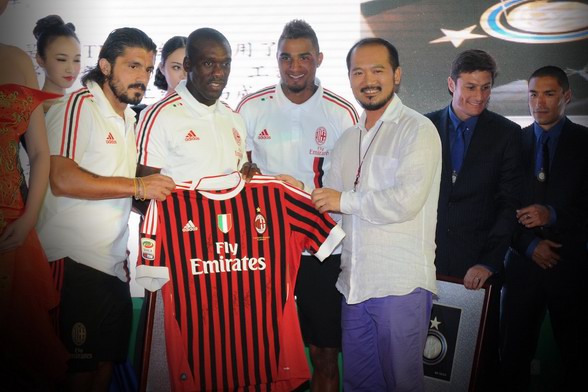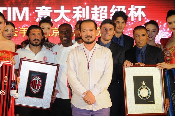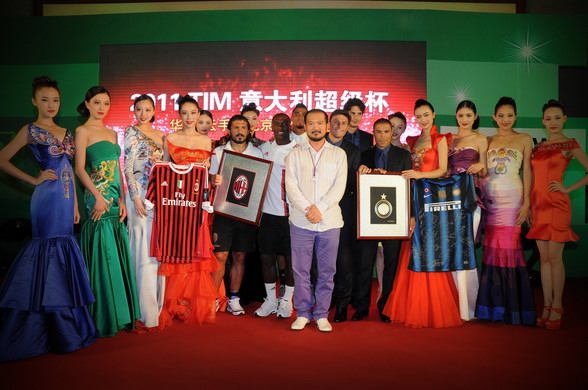 张志峰与两队球员、华服秀模特合影 左起加图索、西多夫、博阿滕、张志峰、萨内蒂、科尔多巴、拉诺基亚