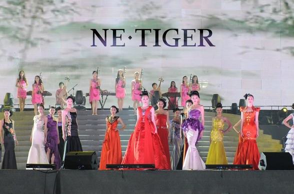 “鸟巢”,史上观众最多的中国国服秀。9月25日,在现场八万人的关注中,在全球亿万观众的视线下,在“三国演艺•中日韩风云音乐盛典”的现场,在陶喆、谢霆锋、李宇春、仓木麻衣、安七炫、Super Junior等众多来自中日韩巨星的瞩目下,在“女子十二乐坊”中国音乐的伴奏下,随着中日韩三国60位名模身着中国的国服暨NE•TIGER华服,优雅入场,在那瞬间,终将八万人的激情点燃,无论是中国的观众,又或是来自日韩的友人。在那一刻,全场无一不为华服之美而动容。中华民族“衣冠上国,礼仪之邦”的民族精神再次在“鸟巢”闪耀。