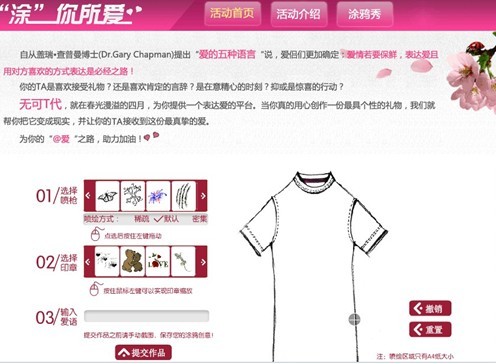 除此以外,无可T代还推出了以爱为线索的三部曲主题活动。其中,爱的第一步,即为"涂"你所爱--T恤涂鸦设计大赛!这是一款专为无可T代@Tee系列设计的falsh小游戏!网友可自己选择T恤印花、图案,并添加个性爱语,设计出只属于自己的专属@Tee。操作简单,互动性、趣味性十足,并且通过评选,最终最具人气的@Tee设计稿,还有可能被制作成实物,送给创作者这份世界上独一无二的礼物!这个活动,迎合了当下的营销趋势--趣味性、互动性,激发了网友的自主参与热情。