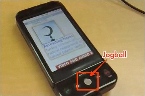 G1机身正面有一个被称作Jogball的按键,类似于黑莓手机常用的轨迹球,可以用来滑动控制系统界面。