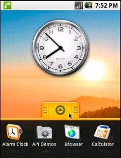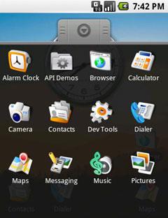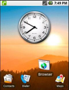 G1的系统主界面十分简洁,采用增强型的Widget桌面主屏幕,中央偏下有一个程序下拉菜单按键,用户也可自行在桌面上添加常用的程序快捷方式。