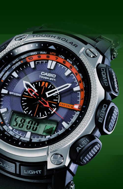 PRW-5000在表盘的设计上独具匠心,非常特别。采用了罗盘式的表盘,增强了户外感和酷劲感。另外表款的按钮设置采用了大尺寸,即便是在寒冷的气候条件里,戴着手套你都可以简单轻便的操作。三个大号按钮,COMP数字罗盘,显示在12点方向的16个方位,以及365度范围之内的角度;BARO气压计温度计按钮,大气压的数据每隔两个小时可以自动更新;ALTI高度按钮,可以显示你当前的高度数据,每隔两分钟或5秒钟就自动更新。