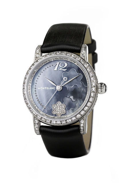 在这款腕表的设计上,万宝龙Le Locle表厂设计的灵感取自于万宝龙的六角白星标志,设计团队在珍珠母贝表壳上向白朗峰致意。醒目的万宝龙六角白星,在〝6点钟〞的位置以34颗明亮式切割的钻石镶崁。表盘的左边,由〝7点钟〞到〝12点钟〞位置,是一个由22颗包铑珍珠打造的弧形,珍珠由大到小依序排列。表缘由一圈80颗明亮式切割美钻环绕,并在表圈上镶崁42颗明亮式切割美钻。另外,表耳由20颗钻石装饰,两边表耳之间则是系上亮泽的绸缎表带。收藏家在18K白金表冠上,再度与万宝龙六角白星相会,镶崁了1颗0.055克拉的万宝龙六角星钻(Montblanc Diamond),独家专利切割,形成万宝龙最知名的标志。