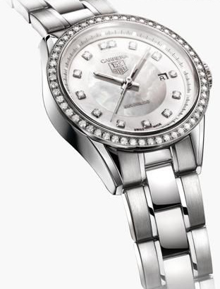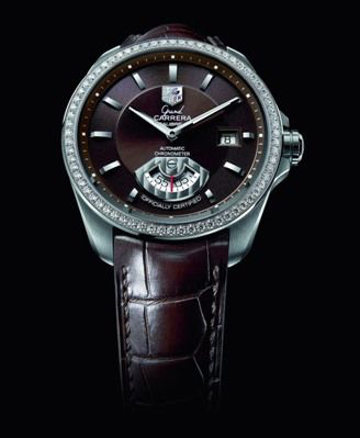 奢华的Ghrand CARRERA 系列以钻石璀璨的光泽映射杰出女性百变的气质与魅力。该腕表抛光固定的不锈钢切面表圈内嵌有68粒优质维谢尔顿钻石,当今最IN的巧克力色表盘可搭配钢质表带或鳄鱼皮表带,烘托出她不失神秘的大气和非同凡响。40.2毫米直径的码表,配以豪雅Calibre 6 RS机芯,位于6点方位的小型秒针旋转系统,饰有“日内瓦波纹”及钻石切割边角,实心钢质的折叠式安全按钮带扣及其豪雅标志图案使其更添魅力。