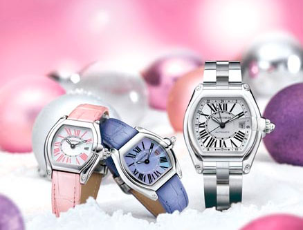 在圣诞来临之际,卡地亚带来了限量版的Roadster紫色和白色贝母表盘精钢腕表、Tank Fran?aise蓝色贝母表盘精钢腕表、Santos Demoiselle 紫色表盘精钢腕表等。