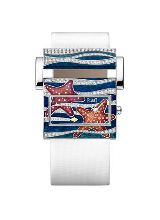 伯爵Miss Protocole珐琅彩绘腕表将我们带入了神奇的海洋世界——以不透光珐琅彩绘制造白色或粉红色贝壳图案,呈现沙滩的意象,而透明珐琅彩绘出的珊瑚及海星图案,则表达了海洋深邃的群礁风情。