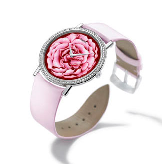 这款珐琅表的外观,采用了中国元素牡丹花的设计,那盛开的粉色花朵象征着繁荣富贵。花朵有非常细致的立体层次感,散发着璀璨光彩。