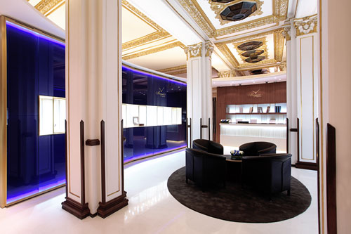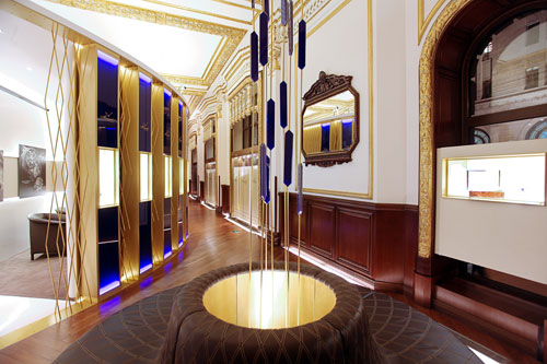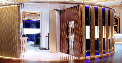店铺内部着重采用宝蓝色雕刻玻璃装饰,如同约瑟芬皇后怀表上的机刻纽索状珐琅装饰纹。修长的金色支架作为产品展示区与销售区的分隔,该设计让人们不禁联想起Breguet(宝玑)最经典的特色之一:装饰着三维机刻纽索纹的表盘。精品店休息区的特色无疑是一盏特制的大吊灯,是为斯沃琪艺术中心度身定制的艺术精品。